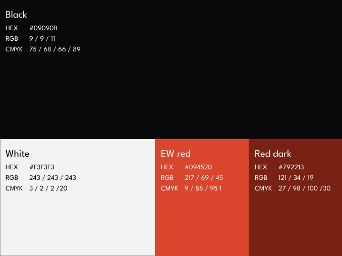 Enterwell’s color palette consists oh primary black and red, followed with white and dark red. In combination with different red and grey gradients they build our color system.