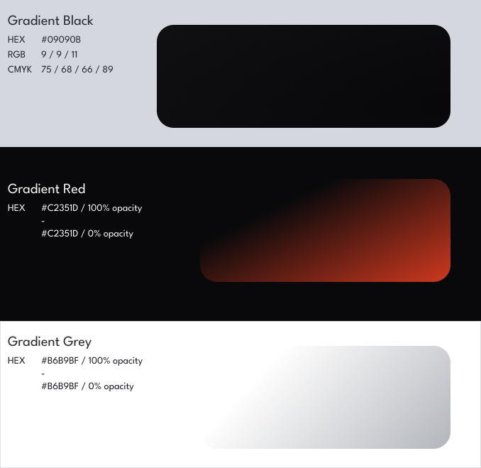 Black gradient is used as a background, while red and grey gradients are always used on a black background.
